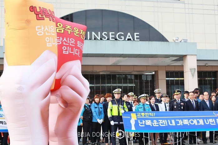 광주서부경찰서(서장 이유진)는 4월 27일(목) 오전 8시 광천동 신세계백화점 앞 광장에서 '3대 교통반칙(음주, 난폭·보복, 얌체운전) 근절 문구가 새겨진 대형 '캐릭터 Air 조형물'을 활용한 대대적인 캠페인을 펼쳤다.