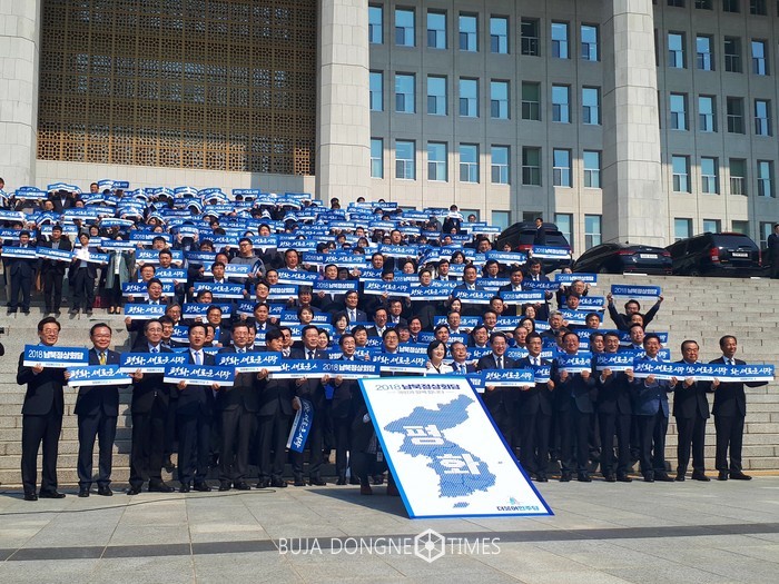 여기에 굴하지 않겠다. 이제 열린 이 길은 누가 막더라도 막을 수 없는 대세의 길이고, 활짝 열린 길이고, 큰 길이다. 이미 미국의 트럼프 대통령도 그 큰길로 함께 가겠다고 손을 잡았고, 주변 강국도 다 같이 손을 잡았다. 더불어민주당은 집권여당으로서 이 정상회담이 따뜻한 햇볕 속에 봄과 함께 우리 민족에게 봄을 알리는 그 길로 갈 수 있도록 최선을 다해서 정상회담이 성공적으로 열릴 수 있도록 최선을 다하겠다. 저희가 열심히 나서서 21세기 평화와 통일의 길을 반드시 열겠다.