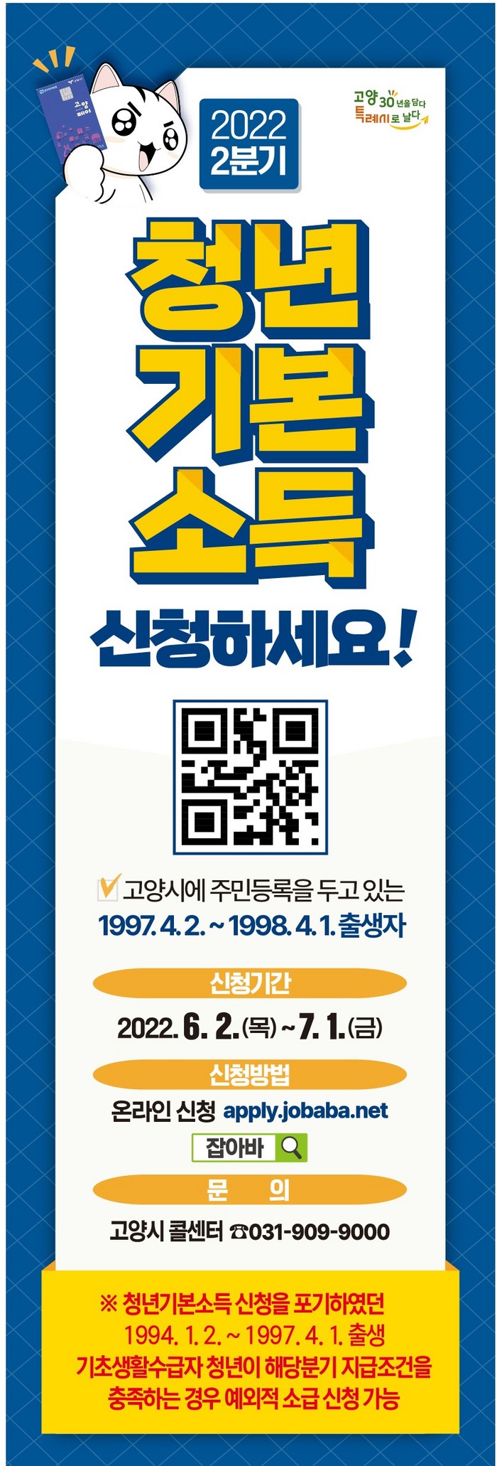[부자동네타임즈 김인수기자] 고양시가 청년의 정기적인 소득지원을 통한 사회활동 촉진 및 사회적 기본권 보장을 위해 2022년 7월 1일 오후 6시까지 2분기 청년기본소득 신청을 접수 받는다.