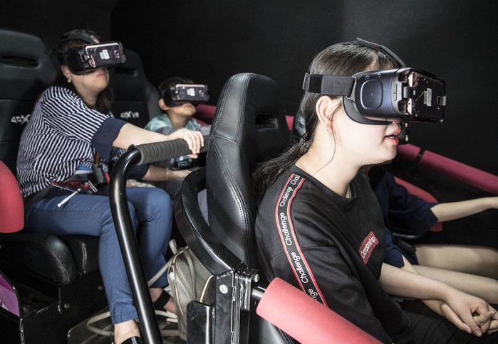 [사진설명] 경기장을 방문한 관람객들이 VR기기를 쓰고 4DX 라이더에 탑승해 서킷을 달리는 듯한 가상체험을 하고 있다.