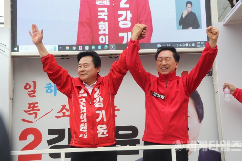 4.10총선이 나흘 앞으로 다가온 가운데 주말 유세전이 한창인 가운데 국민의힘 김기현 전 대표가 6일 오후 창원시 성산구 남양장을 찾아 강기윤 후보에 대한 지원유세를 펼쳤다.