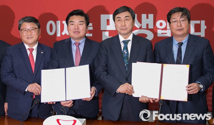 (서울=포커스뉴스) 여야 원내지도부가 2일 오전 서울 여의도 국회에서 열린 예산안 및 법안 처리 관련 회담을 마친 뒤 합의문을 들고 취재진을 향해 포즈를 취하고 있다. 왼족부터 조원진 새누리당 원내수석부대표, 원유철 원내대표, 이종걸 새정치민주연합 원내대표, 이춘석 원내수석부대표.