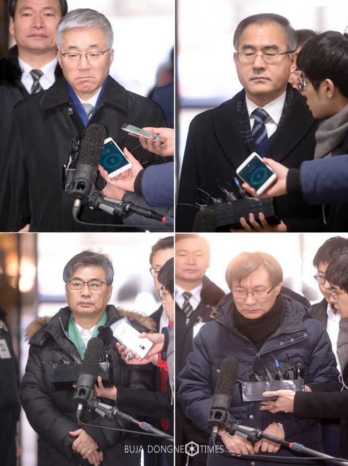 문화예술계 블랙리스트' 의혹에 연루된 김종덕 (왼쪽부터 시계방향)전 문화체육부장관, 김상률 전 대통령 교육문화수석비서관, 정관주 전 문체부 차관, 신동철 전 정무비서관이 영장실질심사에 출석하기 위해 11일 오전 서울 서초구 서울중앙지법으로 들어서고 있다. 특검은 4명에 대해 직권남용 권리행사방해와 강요 혐의 등으로 구속영장을 청구했다. 2017.01.11.