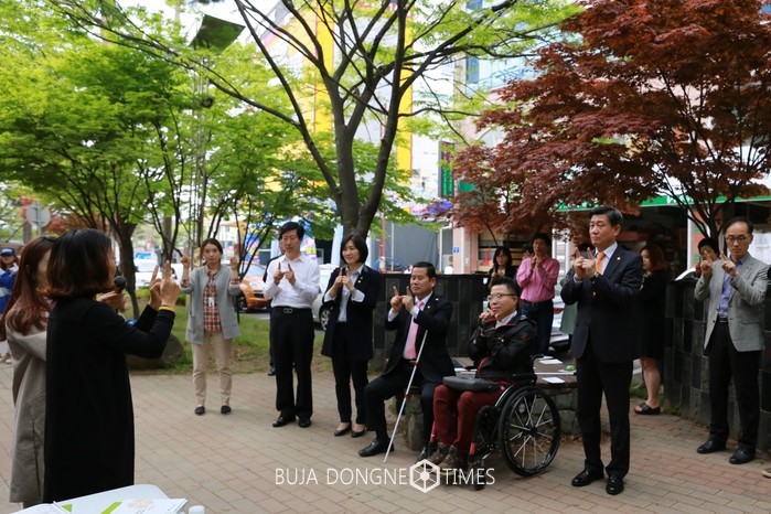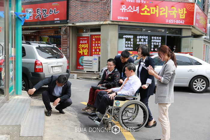 휠체어와 지팡이를 짚고 간이턱과 횡단보도, 계단 등 백운광장 인근을 지나가보며 현실에서 장애인들이 겪는 어려움을 직접 체험한 후 남구청 인근 장애인 편의시설 실태조사에도 함께 동참했다.