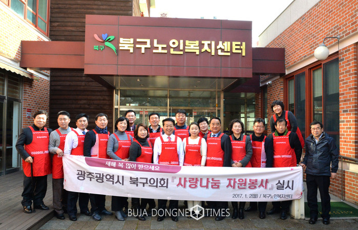 광주 북구의회(의장 김상훈)는 2017년 새해를 맞이하여 첫 업무 시작일인 1월 2일(월) 오전 11시부터 2시간 동안 문흥동 북구노인복지센터에서 북구의원 19명과 의회사무국 직원들이 참여하여 배식봉사를 펼쳤다.