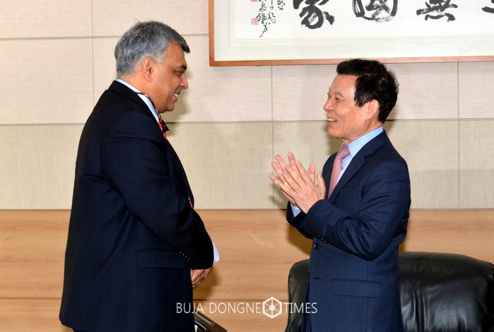 윤장현 광주광역시장은 21일 오전 시청 3층 접견실에서 마힌드라 코리아 딜립 순다람 사장을 접견하고 전기자동차 등 상호 관심 분야를 논의했다.