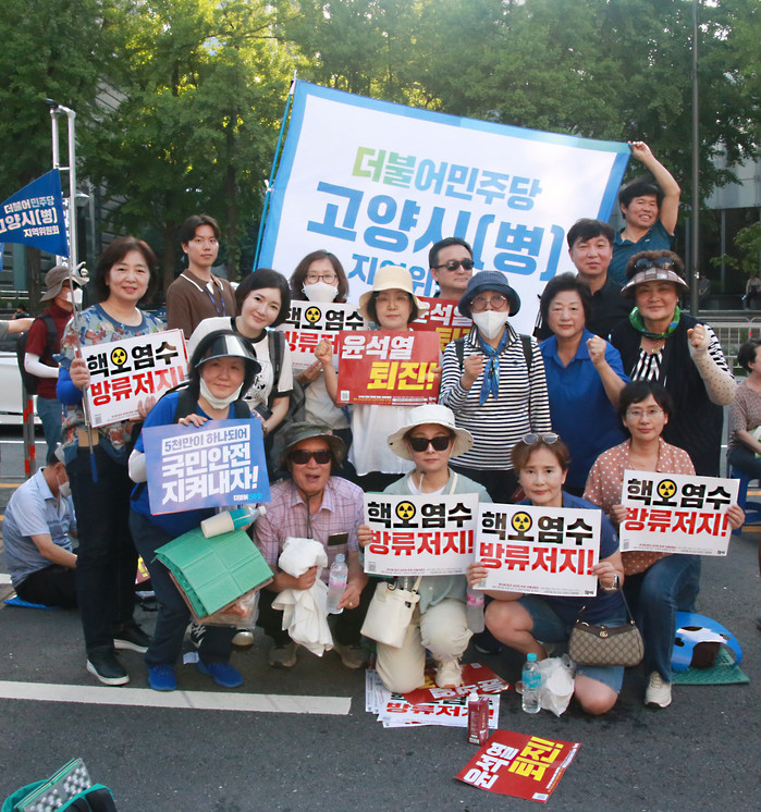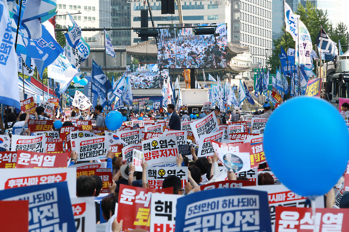 민주당 주최로 열린 집회에 참석해 연단에 오른 이재명 대표는 “후쿠시마 핵 오염수 민주당과 함께 반드시 막아내야되겠죠? 후쿠시마 오염수 방류 반대한다”고 했다. 박광온 원내대표는 “5000만 하나되어 국민 안전 지켜내자”고 외쳤고, 집회 참가자들은 “지켜내자”를 세 번 외쳤다.