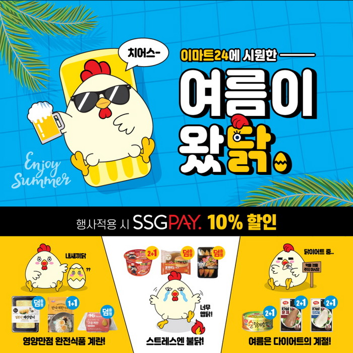 7월 한 달간 닭가슴살, 구운계란, 불닭 등 닭과 관련된 상품 9종에 대해 1+1, 2+1 등 증정 행사와 함께 SSG페이 결제 시 10% 추가 할인 혜택을 제공하는 '여름이 왔닭' 이벤트를 진행한다.