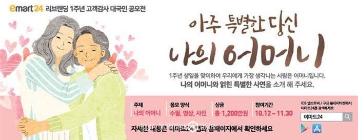 이에 이마트24는 고객 참여형 문화 마케팅 확대 차원에서 공모전을 정기적으로 열기로 결정했다. ‘나의 어머니’ 공모전과 마찬가지로 수필, 사진, 영상 총 3개 부문에서 작품을 모집할 예정이다.