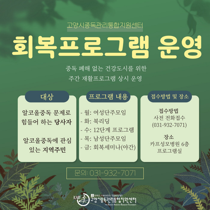프로그램은 고양시 백석동에 위치한 카프성모병원 6층 소강당에서 진행되며 평소 알코올중독 문제로 힘들어하는 당사자 및 알코올중독에 관심이 있는 지역주민 누구나 참여할 수 있다.