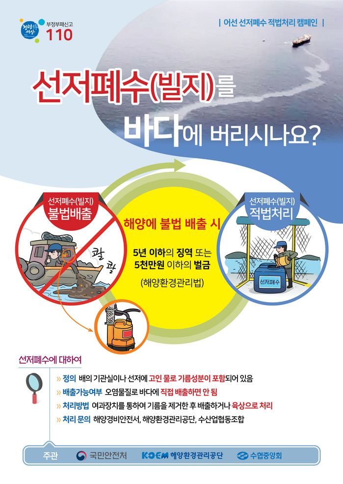 이번 캠페인은 선저폐수의 적법한 육상처리를 통해 깨끗한 해양환경 조성을 위해 마련된 것으로 선저폐수 적법처리 포스터, 현수막, 전광판을 활용하여 홍보에 나서는 한편, 어민을 대상으로 홍보물을 직접 배포하며 홍보에 나설 예정이다.