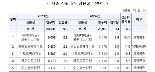 대표적인 사례가 바로 뇌 기능 개선제로 알려진 콜린알포세레이트 성분의 의약품이다. 국민건강보험공단이 발표한 2024년 급여 의약품 지출현황을 분석해보면 이 성분 하나에만 2024년 한해 5천576억원의 건강보험 재정이 투입됐다. 이는 전체 성분별 청구 순위에서 고지혈증 치료제에 이어 당당히 2위를 차지한 기록이다.