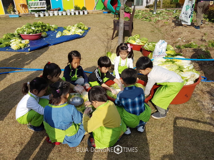 유아들이 지난 늦여름 유치원 텃밭에 심었던 가을 배추 모종 120여 포기에 물을 주고 가꾸어 무공해로 자란 배추를 수확하고 다듬어 씻고, 소금으로 절인 배추로 김치를 담그는 전 과정에 유아와 교사가 함께 참여했다.