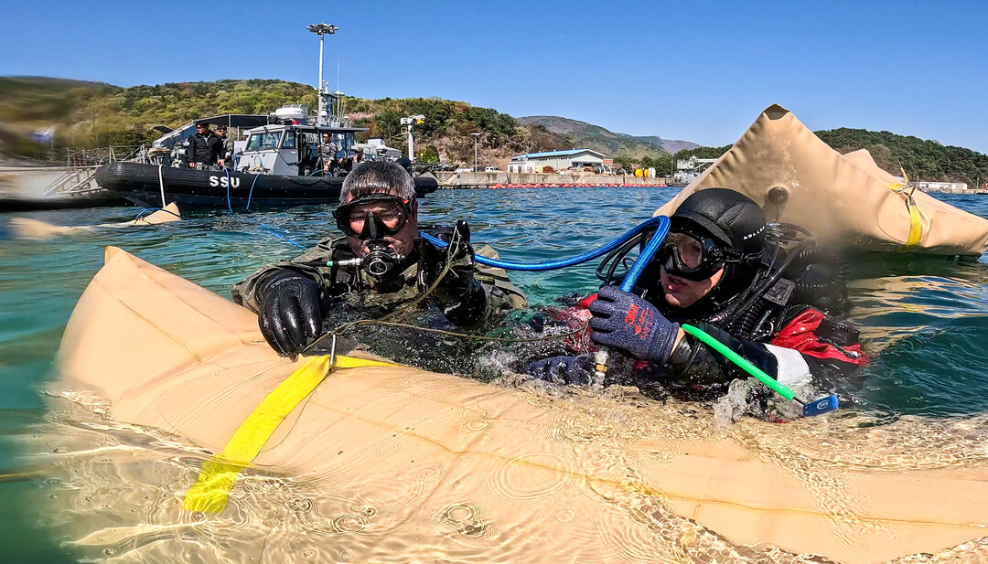 [부자동네타임즈 = 조영재 기자] 8일 경남 진해만 일대에서 진행된 연합 구조전 훈련에서 한국ㆍ호주 해군 잠수사들이 모의 침몰 선박 인양을 위해 리프팅백에 공기를 주입하고 있다. 2026.4.9 [해군 제공]
