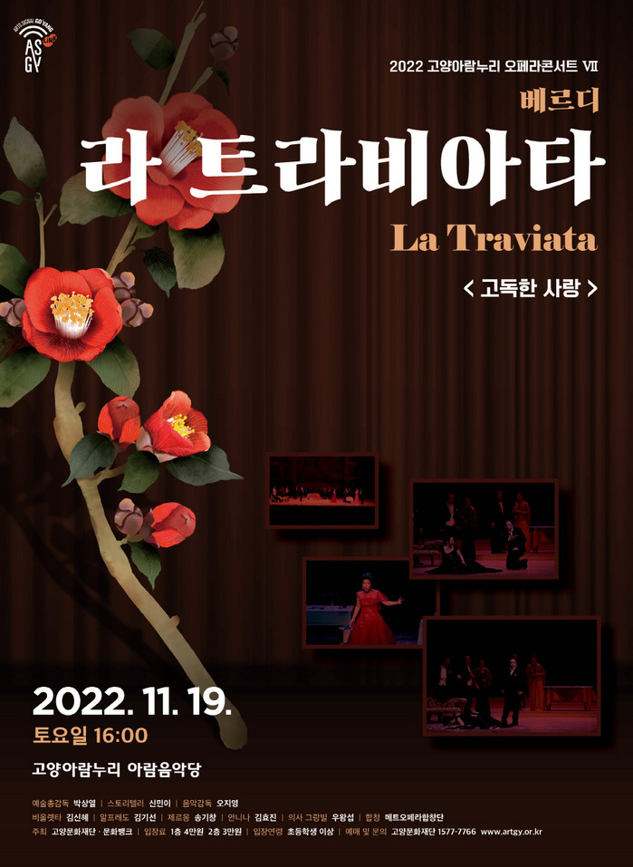 [부자동네타임즈 김인수기자] 고양문화재단(대표이사 정재왈)은 2022 아람누리 오페라 콘서트 시리즈의 세 번째 무대로 전 세계가 가장 사랑하는 오페라, 한국에서는 <춘희>로 알려진 한국 최초의 서양 오페라 <라 트라비아타>를 오는 11월 19일(토) 오후 4시, 고양아람누리 아람음악당에서 선보인다.