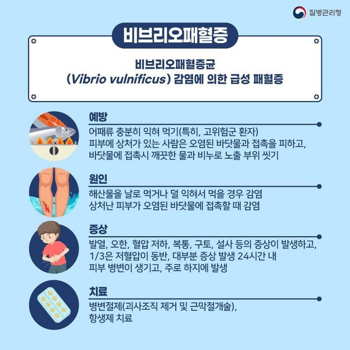 비브리오패혈증은 매년 5~6월경에 발생하기 시작하여 8~9월에 가장 많이 발생한다. 주로 어패류 섭취 또는 피부의 상처와 바닷물이 접촉해 감염된다. 감염되면 주요 증상으로 급성 발열, 오한, 혈압 저하, 복통, 구토, 설사 등이 나타난다.