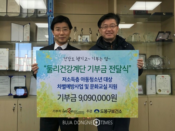 [부자동네타임즈 이병도 기자]렛츠런문화공감센터 도봉지사는 지난 1월 10일, 2017년 둘리건강계단 이용자 누적 걸음수로 확보한 기부금 9,090,000원을 도봉구(구청장 이동진)에 전달하였다.