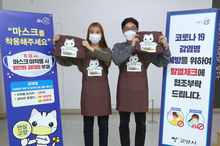 ‘마스크 착용 홍보 앞치마’ 배부 업소는 프랜차이즈형을 제외한 관내 음식점·카페 10,394개소다. 고양시는 매장 규모 200㎡ 이상 업소는 5개, 200㎡ 미만 업소는 3개 등 총 32,666개의 앞치마를 오는 12월 14일까지 배부 완료한다는 계획이다.