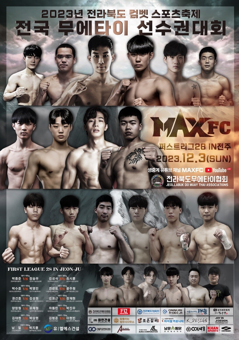 이번 MAX FC ‘퍼스트리그 28 IN 전주’ 대회는 12월 3일 전북 전주 화산체육관에서 개최되며, VIP를 제외한 전 관람석 무료 입장으로 진행되며, 유튜브 MAX FC 채널에서 생중계된다.