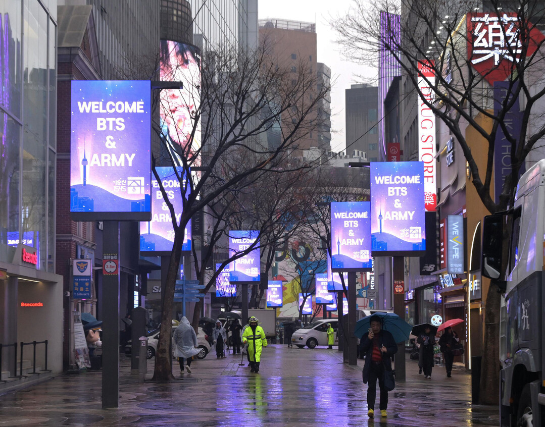 [부자동네타임즈 = 서소민 기자] 서울 중구는 방탄소년단(BTS) 광화문 공연과 봄 관광 시즌을 앞두고 지난 18일 명동 거리의 미디어 폴에서 BTS 환영 영상을 송출하고 거리 물청소를 했다고 19일 밝혔다. 사진은 미디어 폴에서 BTS와 팬클럽 아미 환영 메시지가 송출되고 있는 모습. 2026.3.19 [서울 중구 제공]
