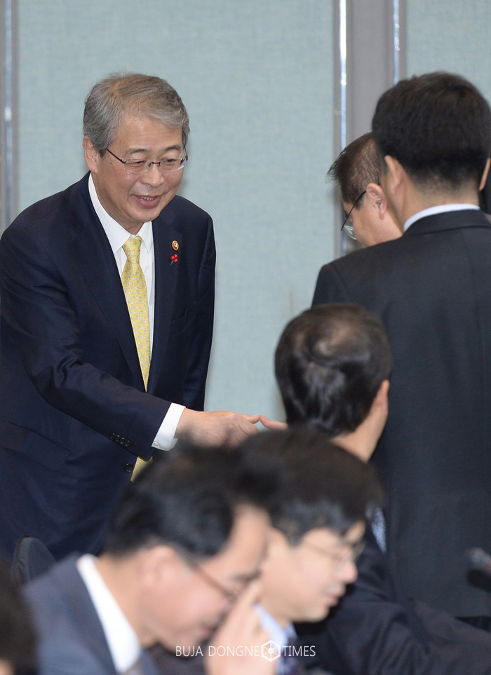 임종룡 금융위원장이 18일 오전 서울 중구 예금보험공사에서 열린 금융발전심의회 제1차 전체회의에서 참석자들과 인사를 나누고 있다. 2017.01.18.