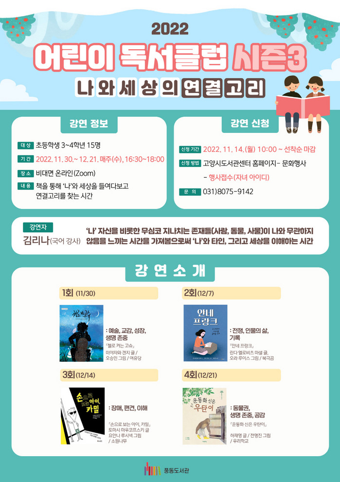 [부자동네타임즈 김인수기자] 고양특례시(시장 이동환) 풍동도서관은 오는 11월 30일(수)부터 12월 21일(수)까지 총 4회에 걸쳐 초등학생 3~4학년을 대상으로 온라인 어린이 독서클럽을 진행한다.