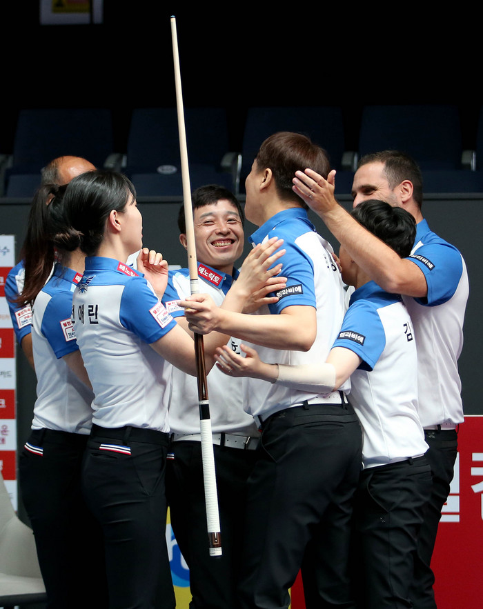 [부자동네타임즈 김인수기자] 지난 7일 경기도 고양시 ‘고양 킨텍스 PBA 스타디움’에서 열린 ‘웰컴저축은행 PBA 팀리그 2023-2024’ 1라운드 5일차 경기서 휴온스는 풀세트 접전 끝에 에스와이를 상대로 세트스코어 4:3 승리를 거두고 하나카드(승점10)에 이은 단독2위(승점9)로 올라섰다. 특히 7세트 패배 직전에서 팀을 구한 주장 최성원의 승부사 기질이 빛났다.
