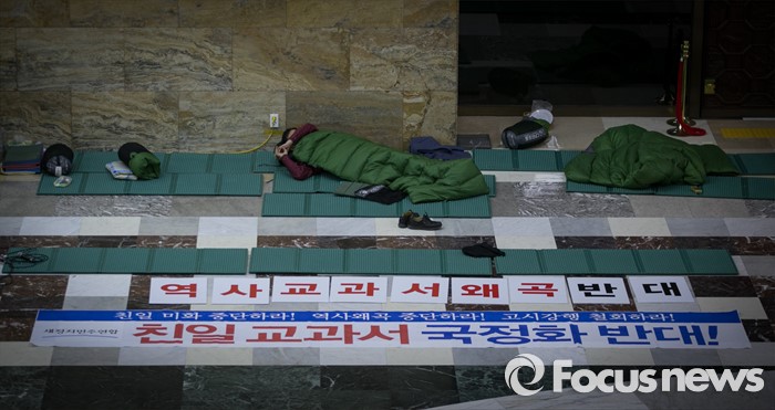 | △ 새정치민주연합이 정부의 역사교과서 강행에 반발해 의사일정 등을 거부하며 농성을 이어가고 있는 6일 오전 서울 여의도 국회 로텐더홀 농성장에서 한 의원이 잠을 자고 있다. <사진제공=포커스뉴스> |