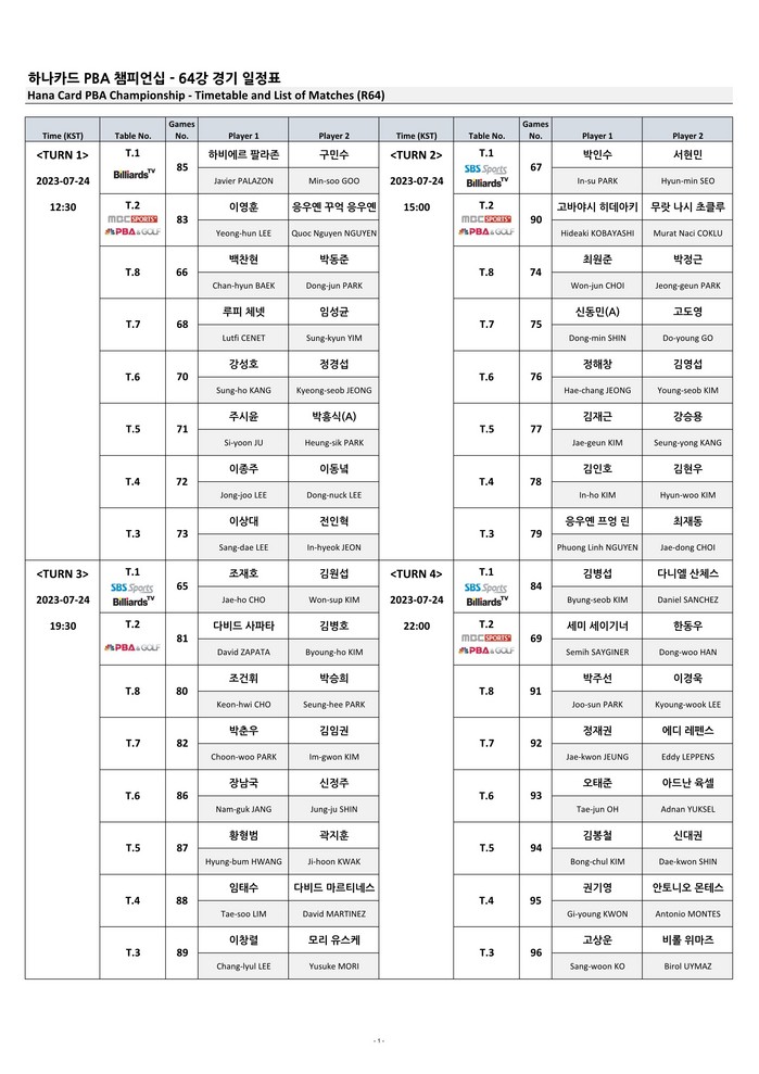 이밖에 직전 투어 준우승자 비롤 위마즈(튀르키예·웰컴저축은행) 에디 레펜스(벨기에·SK렌터카) 이상대(웰컴저축은행) 다비드 마르티네스(스페인·크라운해태) 등도 64강에 합류했다.