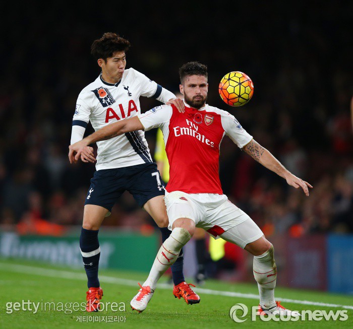 | △ <런던/영국=게티/포커스뉴스> 토트넘 소속 손흥민이 9일(한국시간) 새벽에 열린 아스날과의 잉글랜드 프리미어리그 13라운드 원정경기에서 올리비에 지루와 볼 소유권을 다투고 있다. (C)게티이미지/멀티비츠 |