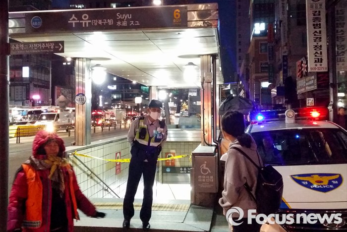 (서울=포커스뉴스) 26일 오전 서울 지하철 4호선 미아역과 수유역 중간 지점에서 작업하던 레일 연마차에 불이 나 성신여대~당고개 구간 10개역의 열차 운행이 양방향 모두 중단됐다. 수유역 6번 출입구 앞에서 한 경찰관이 시민의 출입을 통제하고 있다.