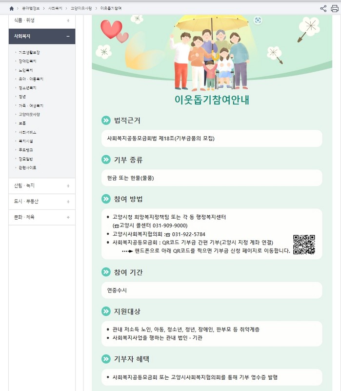 기부를 희망하는 시민은 고양시 홈페이지 분야별 정보란에 사회복지분야 ‘고양이웃사랑’ 게시판에 접속하면 된다. 게시판에 안내된 큐알코드를 핸드폰 카메라로 찍으면 사회복지공동모금회 온라인 기부신청서로 연결된다. 최소 3천원부터 기부할 수 있으며 사회복지공동모금회를 통해 기부 영수증도 발급 받을 수 있다.