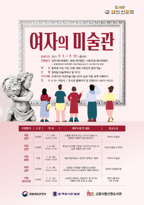 [부자동네타임즈 김인수기자] 고양시 신원도서관은 내달 1일부터 17일까지 길 위의 인문학 프로그램‘여자의 미술관’을 운영한다.