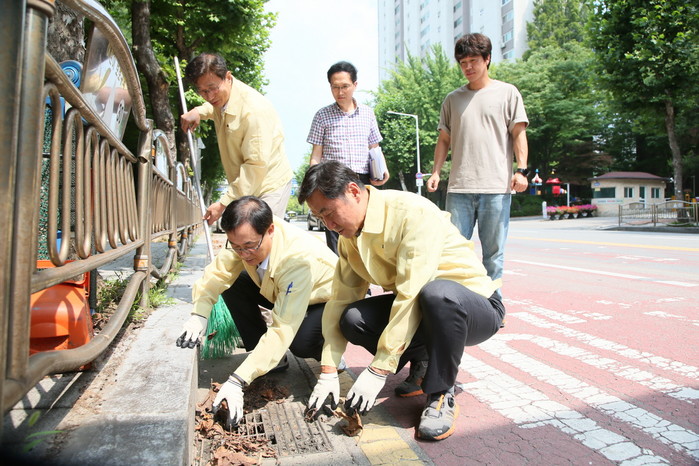 [사진설명] 취임식 대신 "재해취약지역"현장 방문해 직접 청소하고 있는 한창익 덕영구청장.
