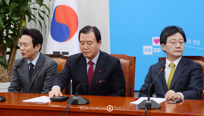 바른정당 유승민(오른쪽) 의원과 남경필 경기도지사가 16일 오전 서울 여의도 국회에서 열린 최고위원회의에 참석해 있다. 가운데는 홍문표 최고위원. 2017.02.16.