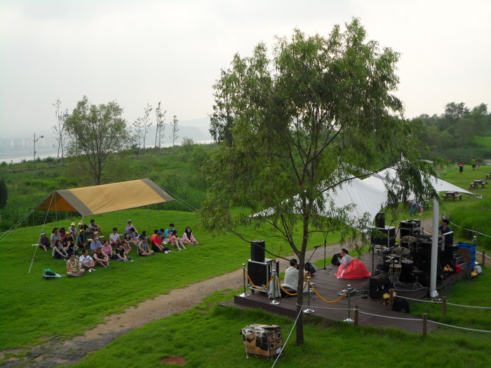 | △ 노을공원 캠핑장 이용객들이 판소리공연을 관람하고 있다. |