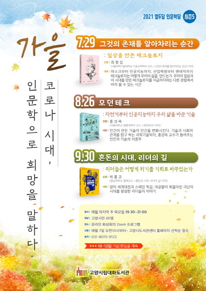 [부자동네타임즈 김인수기자] 고양시 대화도서관이 오는 7월 29일부터 9월 30일까지 ‘열두달 인문학당 시즌5-가을편’을 운영한다. 이번 프로그램은 팬데믹 시대를 살아가고 있는 우리네 삶의 전반을 인문학적으로 성찰해보기 위해 마련됐다.