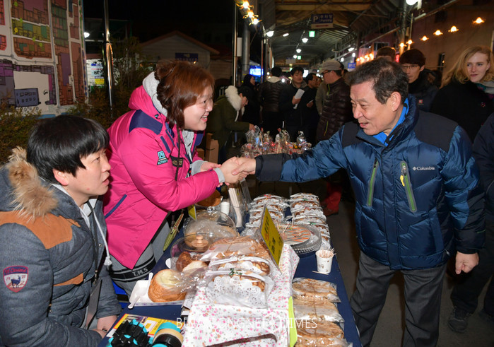 | △윤장현 광주시장이 18일 저녁 올해 첫 개장한 대인예술야시장을 찾아 상가를 둘러보고 상인들을 격려하고 있다 |