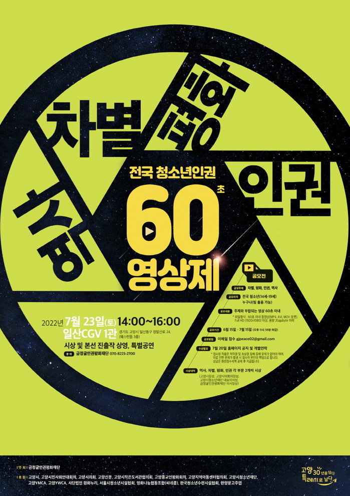 [부자동네타임즈 김인수기자] 고양시 2022년 제1회 전국 청소년 인권 60초 영상 공모전을 개최한다. 시는 6‧25전쟁 민간인 희생자를 추모하고 청소년이 민주주의, 인권, 평화의 가치를 스스로 고민해보는 계기를 마련하기 위해 이번 공모전을 개최한다고 밝혔다.