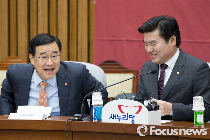 | △ 원유철(오른쪽) 새누리당 원내대표와 김정훈 정책위의장이 13일 오전 서울 여의도 국회에서 열린 원내대책회의에 참석해 대화 중 웃고 있다. 박철중 기자 cjpark@focus.kr |