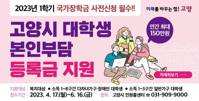[부자동네타임즈 김인수기자] 고양시에서 2023년 1학기 고양시 대학생 본인부담 등록금 지원 사업을 시행한다.