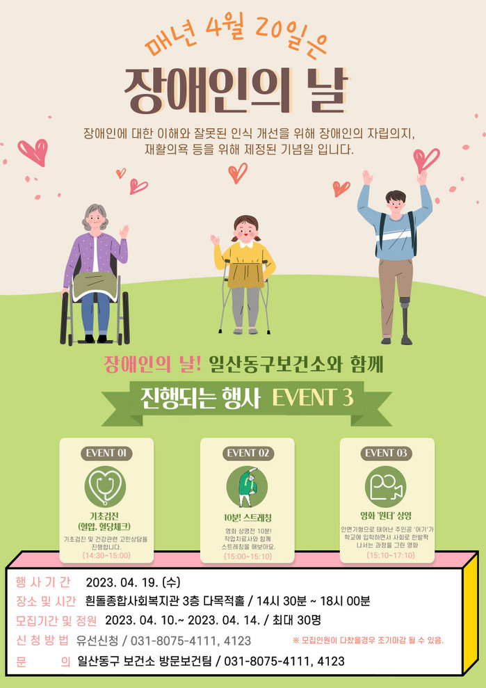 [부자동네타임즈 김인수기자] 고양특례시(시장 이동환) 일산동구보건소는 오는 4월 20일 장애인의 날을 맞아 장애인 인식개선을 위한 행사를 실시한다.