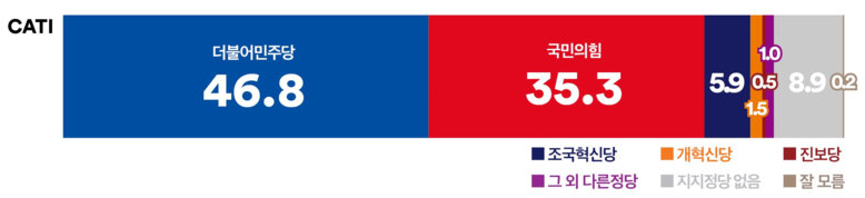 ‘여론조사꽃’이 2월 19일부터 20일까지 이틀간 실시한 전화면접조사에서 ‘더불어민주당’의 지지율은 46.8%, ‘국민의힘’은 35.3%를 기록했다. ‘조국혁신당’의 지지율은 5.9%의 지지율을 보였다. 양당 간 격차는 11.5%p였으며, ‘더불어민주당’과 ‘조국혁신당’의 합산 지지율(52.7%)은 ‘국민의힘’보다 17.4%p 앞선 것으로 나타났다.
