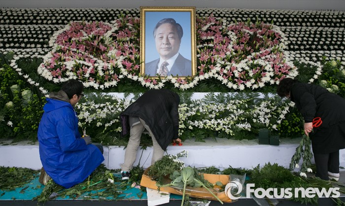 (서울=포커스뉴스) 23일 오전 서울 여의도 국회 본청 앞에서 관계자들이 지난 22일 서거한 김영삼 전 대통령의 국가장 분향소 설치 작업을 하고 있다.