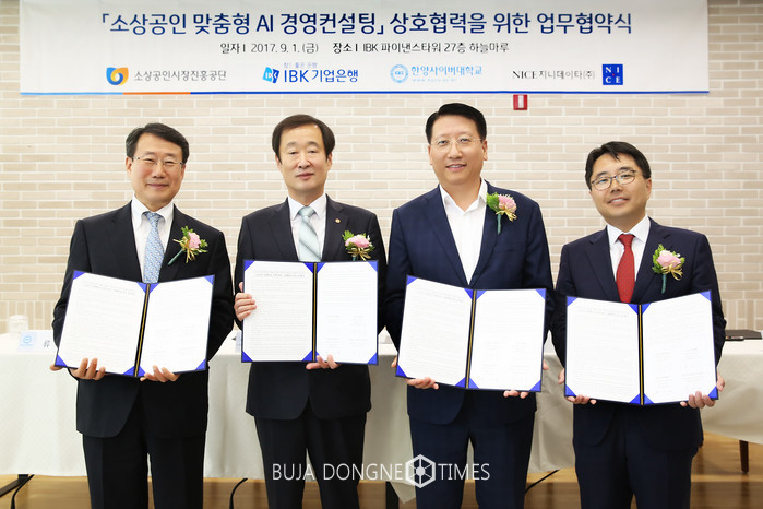 [부자동네타임즈 이현재 기자]IBK기업은행은 서울 중구 을지로 본점에서 소상공인시장진흥공단(이사장 김흥빈), 한양사이버대학교(총장 이영무), NICE지니데이타(대표이사 정선동)와 ‘소상공인 맞춤형 AI 경영컨설팅’사업 지원을 위한 업무협약을 체결했다고 1일 밝혔다.