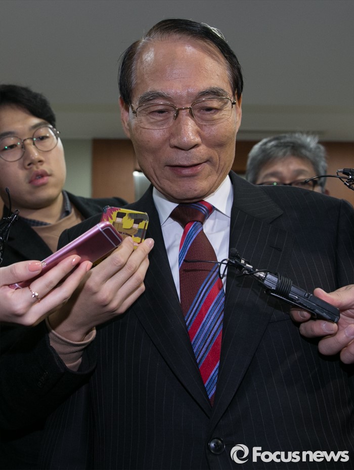 (서울=포커스뉴스) 김만복 전 국정원장이 20일 오전 서울 여의도 새누리당사에서 열린 중앙윤리위원회 전체회의에 참석하며 취재진 질문에 답하고 있다. 김 전 원장은 이날 회의에서 입당 이후 10·28 재보선 당시 새정치민주연합 후보 행사에 참석해 해당행위 논란이 제기된 것과 관련 해명할 예정이다.
