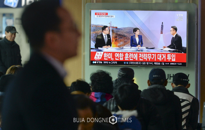 북한이 미사일로 추정되는 발사체 4발을 동해상을 향해 발사했다고 알려진 6일 오전 서울역 대합실에서 시민들이 북한 미사일 발사 관련 뉴스 속보를 지켜보고 있다. 합동참모본부에 따르면 북한은 이날 오전 7시36분께 평안북도 동창리 일대에서 동해상으로 불상발사체를 발사, 황교안 대통령 권한대행은 북한이 미사일로 추정되는 발사체와 관련해 국가안전보장회의(NSC) 상임위원회를 긴급 소집했다.