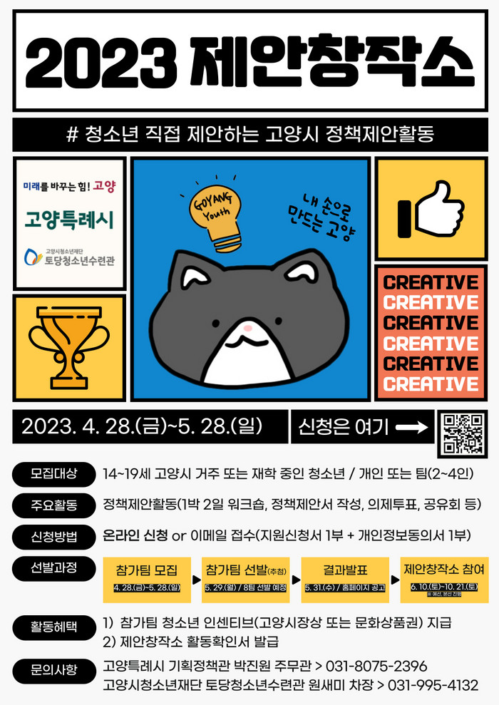 청소년 제안창작소 신청 기간은 오는 5월 28일(일)까지이며, 14세부터 19세 연령에 해당하는 고양시 거주 또는 재학 중인 청소년이라면 누구든지 온라인을 통해 접수가 가능하다. 세부내용 및 관련 문의는 고양특례시 기획정책관 또는 고양시청소년재단 토당청소년수련관으로 문의하면 안내받을 수 있다.