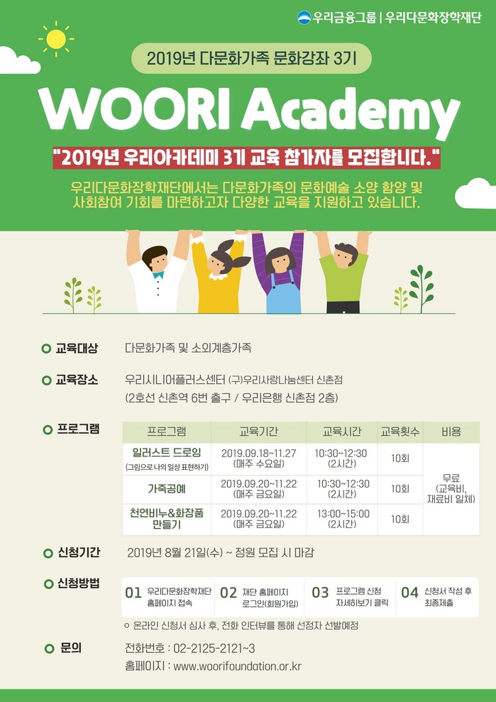 강좌는 우리은행 신촌지점 2층에 위치한 우리시니어플러스센터에서 오는 9월부터 10회에 걸쳐 진행되며, 우리다문화장학재단 홈페이지에서 온라인 신청을 통해 가능하다. 최종 참가자는 접수된 신청서 심사 후, 전화인터뷰를 통해 선발한다.