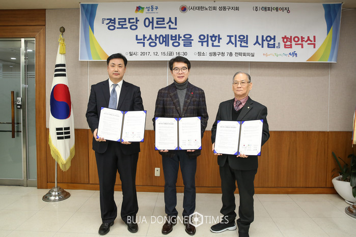 [부자동네타임즈 이병도 기자]성동구(구청장 정원오)는 지난 15일 (사)대한노인회 성동구지회(지회장 임인수), ㈜해피에이징(대표: 권경혁)과 ‘경로당 어르신 낙상예방 지원사업’협약을 체결했다.
